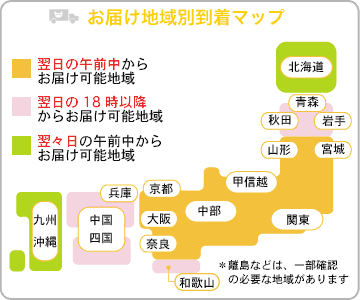●北海道、九州地区へのお届けににつきましては、通常プラス1日頂いております。あらかじめご了承下さい。